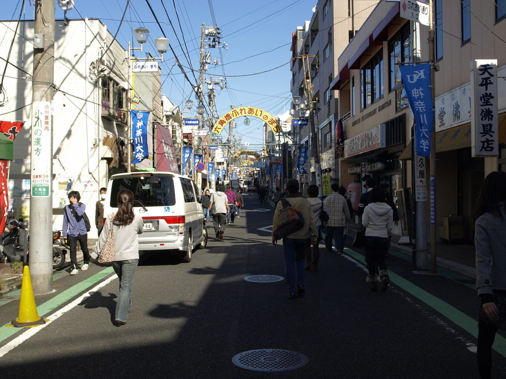 白楽駅から神奈川大学に至る急で賑やかな坂道は、